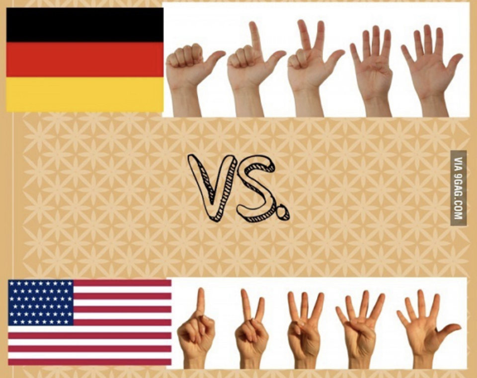 독일식으로 3을 셀때는 엄지, 검지, 중지를 펴지만 영국과 미국식으로 3을 셀때는 검지,중지,약지를 펼친다.