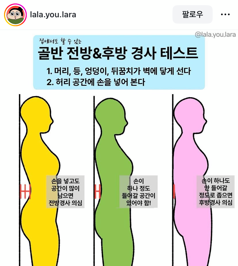 손을 허리와 벽 사이에 넣어본다.- 전반 경사(Anterior Pelvic Tilt): 허리와 벽 사이에 공간이 많이 남아 손이 여유롭게 들어가면 골반이 앞으로 기울어진 상태.